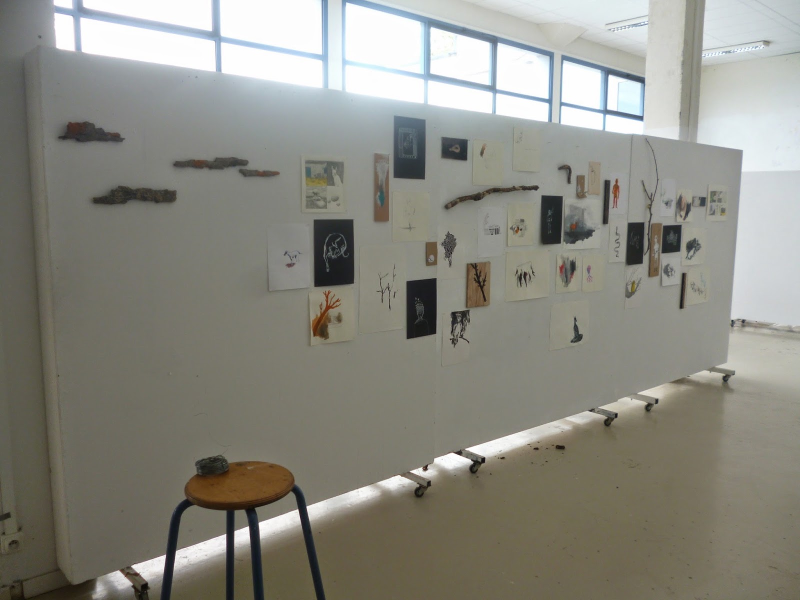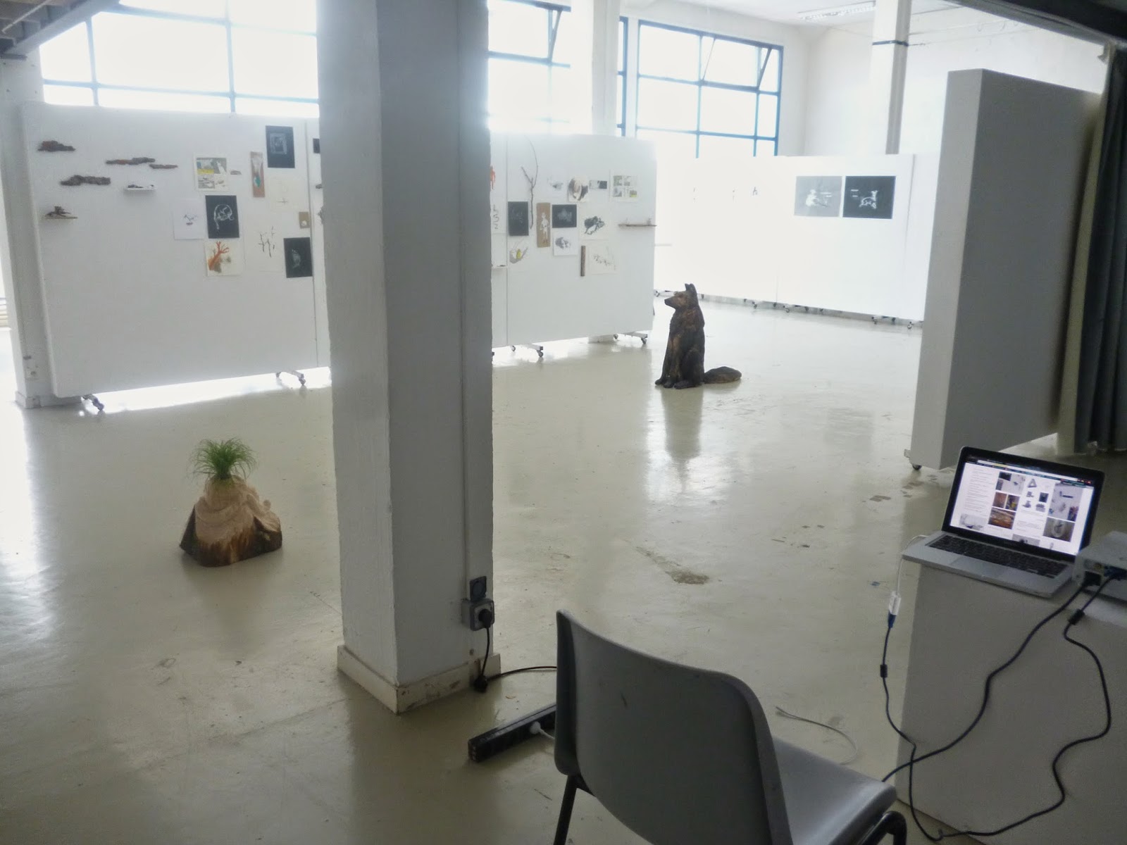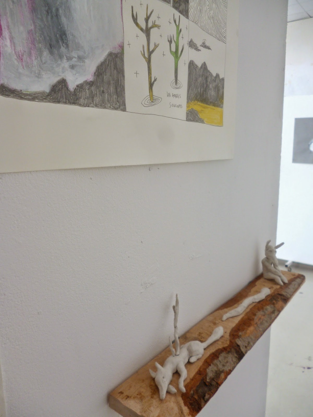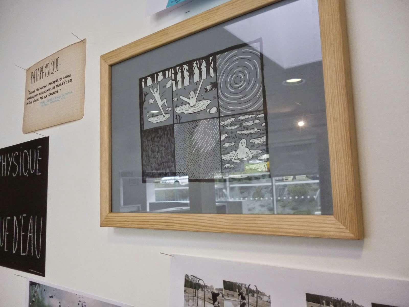 Et qui ouvre sur le reste de l'exposition, et l'installation "Pataphysique d'une flaque d'eau" (2015) qui traite de disparitions dans les flaques d'eau, de particules de Brouillard, de Bouffoir, de Neeru, Dieu local paumé dans une flaque, de drôles de machines, et de mystérieuses démonstrations mathématiques.